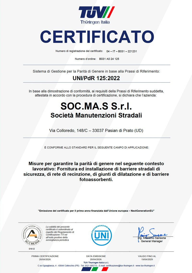 La SOC.MA.S. SRL ha ottenuto negli anni diverse certificazioni e detiene l’Attestazione (SOA), per categorie e classifiche adeguate alla tipologia di lavori sopra descritti. Inoltre, è in via di prossima implementazione un Modello Organizzativo Gestionale ai sensi della L. 231/2001, che dota l’azienda di un Codice Etico e di un Sistema Organizzativo volto ad un continuo miglioramento delle condizioni di lavoro dei dipendenti sia sotto l’aspetto della sicurezza sul posto di lavoro che gestionale, in cui funzioni e responsabilità sono precisamente delineate.